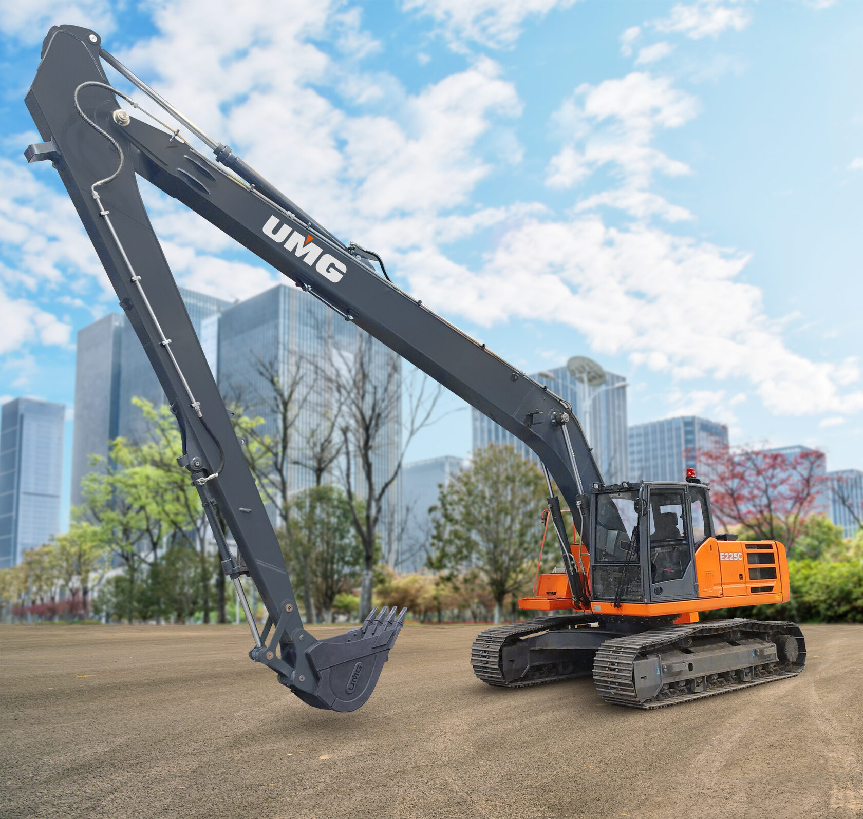 Компания UMG представила новую модификацию гусеничного экскаватора. Е225С LR оснащён двигателем КАМАЗ 667-й серии, обладающим высокой производительностью и топливной эффективностью. С целью увеличения надёжности при работе в тяжёлых условиях для рабочего оборудования применены более прочные марки отечественных сталей, что позволяет уверенно работать с грунтами 4-й категории. Для расширения области применения экскаваторов E225C и E245C разработано, испытано и внедрено в серийное производство сверхдлинное рабочее оборудование с радиусом копания 16 м и глубиной копания 12,27 м, позволяющее увеличить геометрические параметры рабочей зоны при сохранении устойчивости, эксплуатационной надёжности и гарантии, так как это заводское решение для данных машин. Также сверхдлинное рабочее оборудование может поставляться отдельно для установки на уже имеющиеся в эксплуатации у клиентов экскаваторы UMG.
