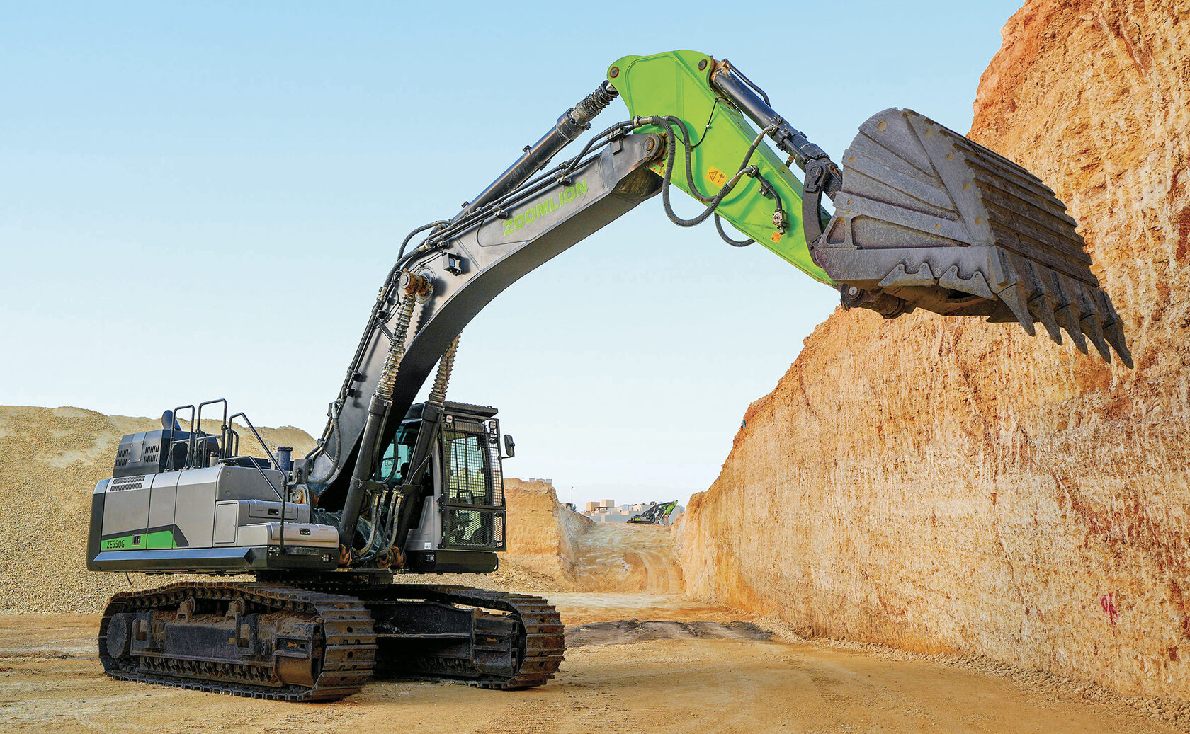 Экскаватор ZE550G, который за счёт увеличенного объёма гидравлических насосов и пониженной частоты вращения позволяет значительно увеличить КПД машины. Система управления E-COT обеспечивает раздельное управление насосами, а также выбор режима работы гидравлической системы, что помогает снизить расход топлива на 8% без потери в производительности.